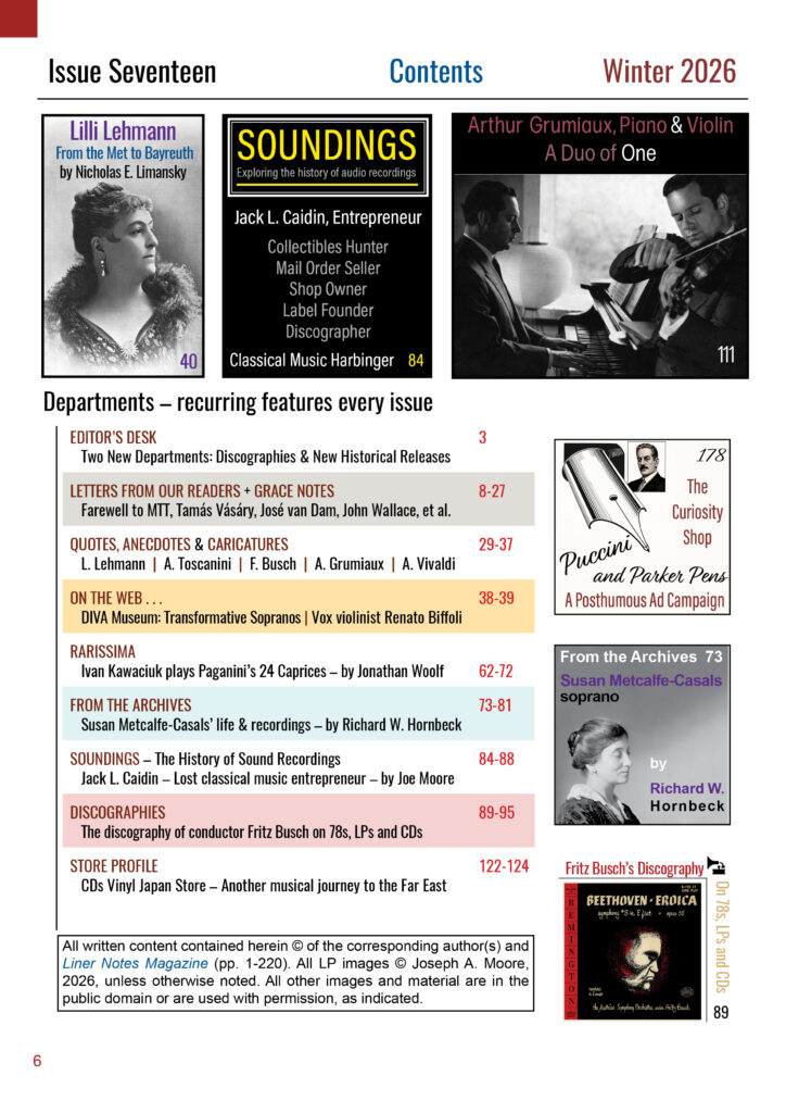 Staying with the vocal arts, this quarter’s Curiosity Shop examines a peculiar 1930s ad campaign launched by the day’s leading writing implement maker, the Parker Pen Company, that involved the posthumous endorsement of composer Giacomo Puccini. Another intriguing footnote in American musical history concerns 1930s/40s entrepreneur Jack L. Caidin, the focus of this quarter’s Soundings. Selling 78s by mail order, a NYC brick-and-mortar shop, collectible discs, independent label founder and Caruso discographer, Caidin was a harbinger of numerous trends that would become commonplace during the post-war years.