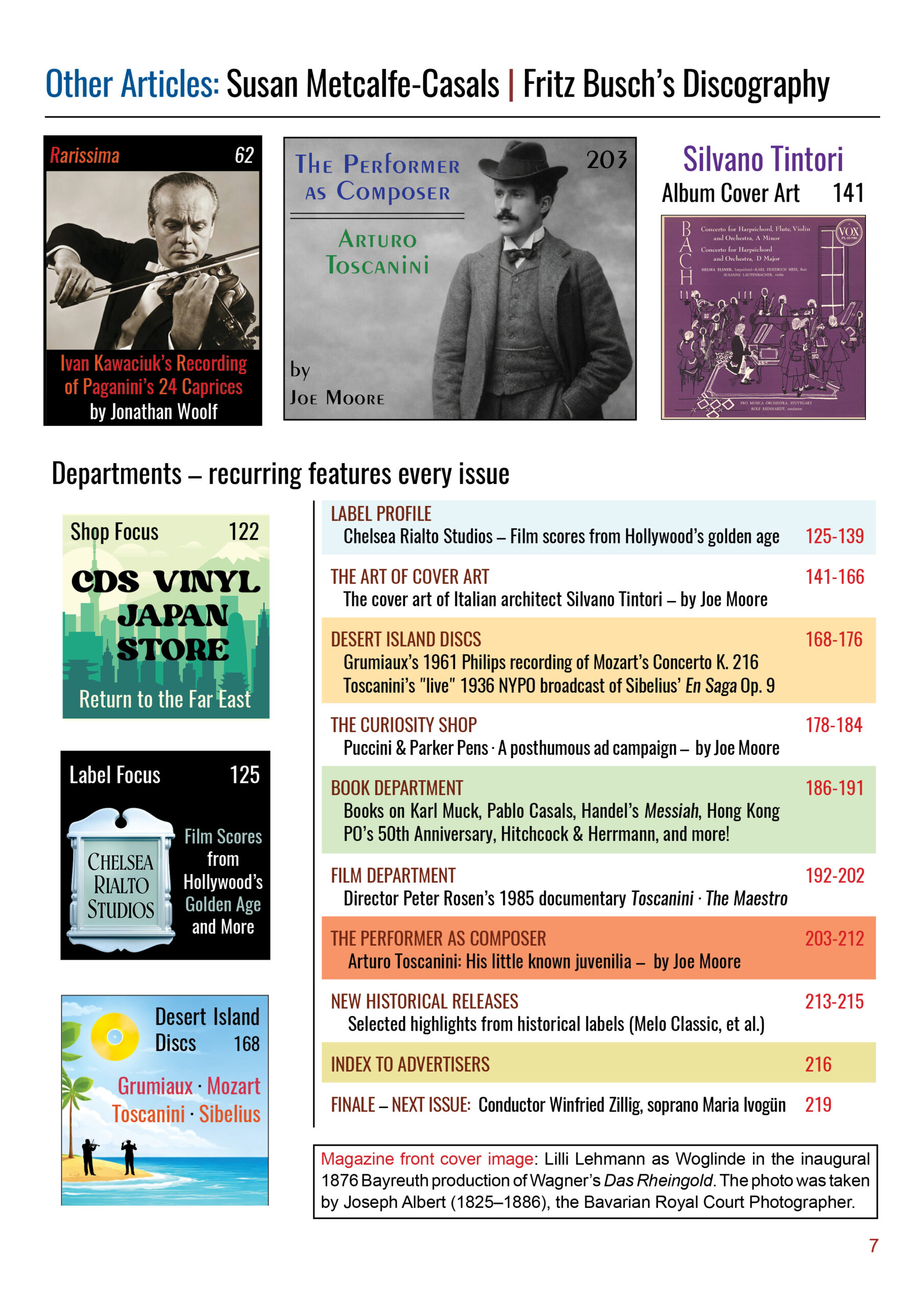 As some of the most memorable scores of the last 90 years were written for film, our Label Focus turns to Chelsea Rialto Studios and founder Ray Faiola’s stunning series of soundtrack restorations from the “Golden Age” of Hollywood. From California we travel west, returning once again to Tokyo where physical products (i.e., LPs and CDs) still outsell digital downloads. CDs Vinyl Japan Store offers what it says and is a delight for the classical collector. Speaking of which, with this quarter we introduce two new departments. In New Historical Releases we highlight interesting new titles from a variety of labels. Also new is our Discographies section. Here, we will try to introduce less prominently visible ones, beginning with Fritz Busch.