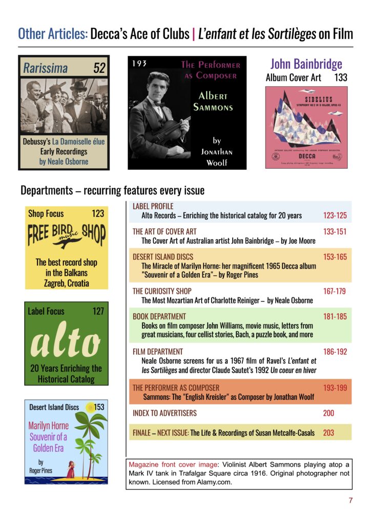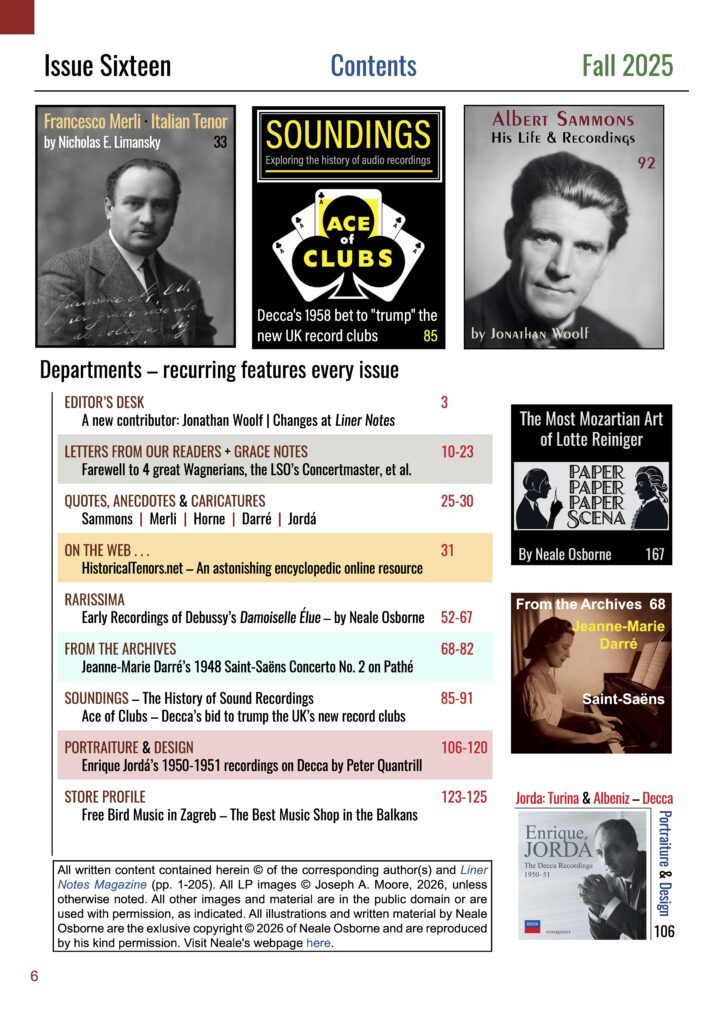Welcome to our Fall 2025 issue. I would first like to introduce a new contributor, Jonathan Woolf, who has supplied two articles on the great English violinist (and composer), Albert Sammons. Many of you will be familiar with reviews Jonathan has written for International Piano and Musicweb-International.com, among other classical music outlets. We are grateful to have him onboard. For nearly two years I have been able to rely on the graphic editing work of Vasily Duda, a Ukrainian designer, whose work has enabled us to re-produce rare photos, album covers and label graphics with such like-new resolution. Thirty pages in the current issue feature work he has done for Liner Notes. He is an absolute wizard not only at restoring archival material, but also at creating new content, and I highly encourage anyone with such needs, be it music-related or not, to contact him.